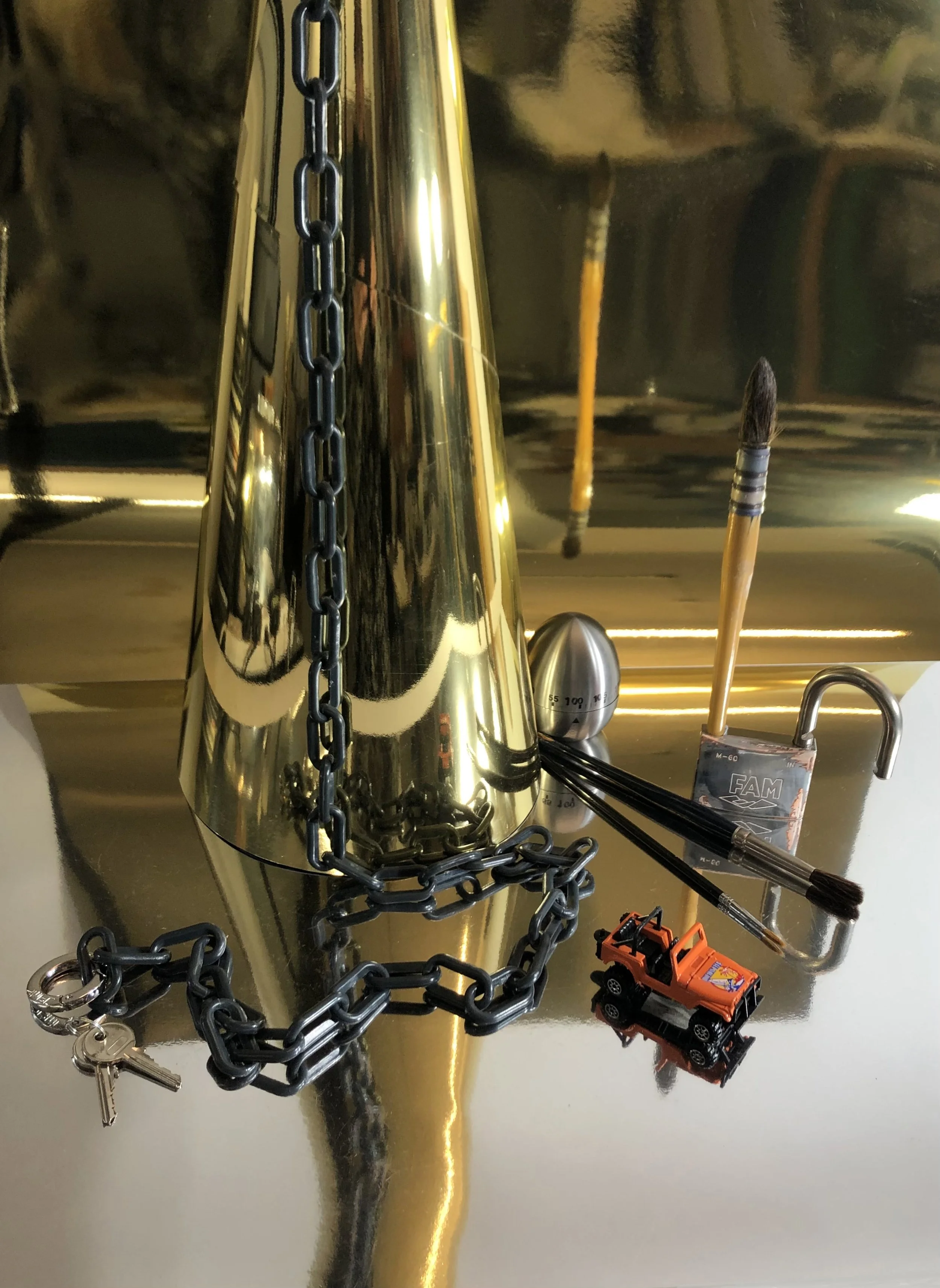 Digital photograph of installation (150 cm diameter skirt, paintbrush, CD, vinyl record)